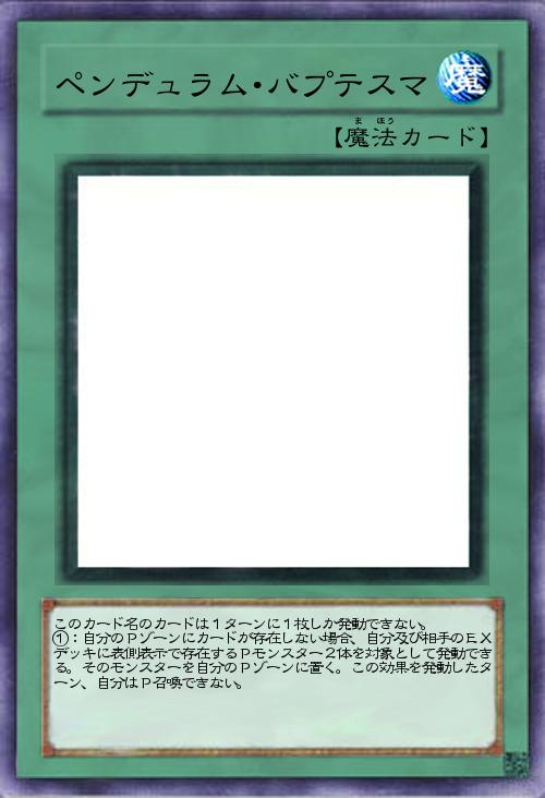 | このカード名のカードは1ターンに1枚しか発動できない。 ①:自分のPゾーンにカードが存在しない場合、自分及び相手のEXデッキに表側表示で存在するPモンスター2体を対象として発動できる。そのモンスターを自分のPゾーンに置く。この効果を発動したターン、自分はP召喚できない。 | |||