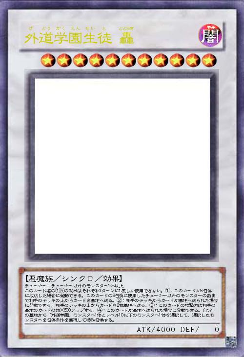 | チューナー+チューナー以外のモンスター1体以上 このカード名の①④の効果はそれぞれ1ターンに1度しか使用できない。①:このカードがS召喚に成功した場合に発動できる。このカードのS召喚に使用したチューナー以外のモンスターの数まで相手のデッキの上からカードを墓地へ送る。②:相手のデッキからカードが墓地へ送られた場合に発動できる。相手のデッキの上からカードを2枚墓地へ送る。③:このカードの攻撃力は相手の墓地のカードの数×500アップする。④:このカードが墓地へ送られた場合に発動できる。自分の墓地から「外道学園」モンスター1体とレベル10以下のモンスター1体を選択して、選択したモンスターを召喚条件を無視して特殊召喚する。 | |||