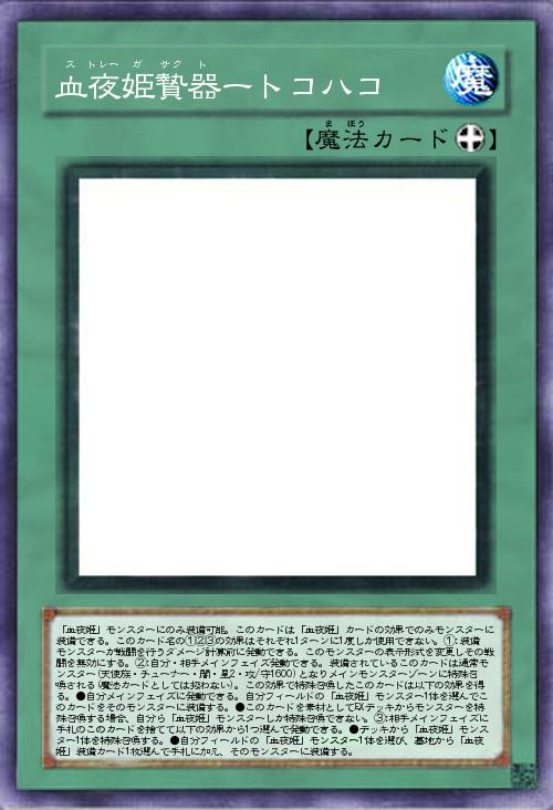 | 「血夜姫」モンスターにのみ装備可能。このカードは「血夜姫」カードの効果でのみモンスターに装備できる。このカード名の①②③の効果はそれぞれ1ターンに1度しか使用できない。①:装備モンスターが戦闘を行うダメージ計算前に発動できる。このモンスターの表示形式を変更しその戦闘を無効にする。②:自分・相手メインフェイズ発動できる。装備されているこのカードは通常モンスター(天使族・チューナー・闇・星2・攻/守1600)となりメインモンスターゾーンに特殊召喚される(魔法カードとしては扱わない)。この効果で特殊召喚したこのカードは以下の効果を得る。●自分メインフェイズに発動できる。自分フィールドの「血夜姫」モンスター1体を選んでこのカードをそのモンスターに装備する。●このカードを素材としてEXデッキからモンスターを特殊召喚する場合、自分ら「血夜姫」モンスターしか特殊召喚できない。③:相手メインフェイズに手札 | |||