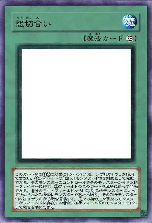 | このカード名の①②の効果は1ターンに1度、いずれか1つしか使用できない。①フィールドの「怨切」モンスター1体を対象として発動できる。そのモンスターのコントロールをそのモンスターから見た相手プレイヤーに移す。②フィールドのこのカードを墓地に送って発動できる。自分の手札・フィールドから「怨切」融合モンスターによって決められた融合素材モンスターを墓地へ送り、その融合モンスター1体をEXデッキから融合召喚する。元々の持ち主が異なるモンスターがフィールドに存在する場合、相手フィールドのモンスターも1体まで融合召喚にできる。 | |||