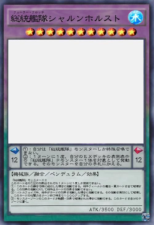 | 「総統艦隊」モンスター×2 このカード名の①②の効果はそれぞれ1ターンに1度しか使用できない。 ①:このカードの融合召喚に成功した場合に発動できる。相手フィールドの魔法・罠カードを全て破壊する。この効果の発動に対して相手はカードの効果を発動できない。 ②:バトルフェイズ中、相手がカードの効果を発動した場合に発動できる。その発動を無効にして破壊し、このカードの攻撃力をターン終了時まで1000アップする。 ③:モンスターゾーンのこのカードが戦闘・効果で破壊された場合に発動できる。このカードを自分のPゾーンに置く。 | |||
