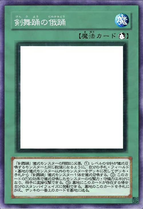 | 「剣舞踊」儀式モンスターの降臨に必要。①:レベルの合計が儀式召喚するモンスターと同じ数値になるように、自分の手札・フィールド・墓地の儀式モンスター以外のモンスターをデッキに戻してデッキ・手札から「剣舞踊」儀式モンスター1体を儀式召喚する。②:このカードの①の効果で儀式召喚したモンスターの攻撃力・守備力は半分になり、相手に直接攻撃できる。③:墓地にこのカードが存在する場合自分のスタンバイフェイズに発動できる。墓地のこのカードを手札に加え、デッキの一番上のカードを墓地に送る。 | |||