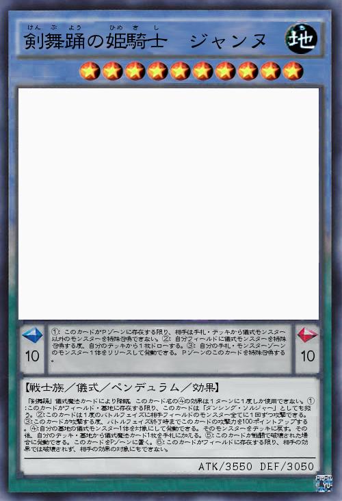 | 「剣舞踊」儀式魔法カードにより降臨。このカード名の④の効果は1ターンに1度しか使用できない。①:このカードがフィールド・墓地に存在する限り、このカードは「ダンシング・ソルジャー」としても扱う。②:このカードは1度のバトルフェイズに相手フィールドのモンスター全てに1回ずつ攻撃できる。③:このカードが攻撃する度、バトルフェイズ終了時までこのカードの攻撃力を100ポイントアップする。④:自分の墓地の儀式モンスター1体を対象にして発動できる。そのモンスターをデッキに戻す。その後、自分のデッキ・墓地から儀式魔法カード1枚を手札に加える。⑤:このカードが戦闘で破壊された場合に発動できる。このカードをPゾーンに置く。⑥:このカードがフィールドに存在する限り、相手の効果では破壊されず、相手の効果の対象にもできない。 | |||