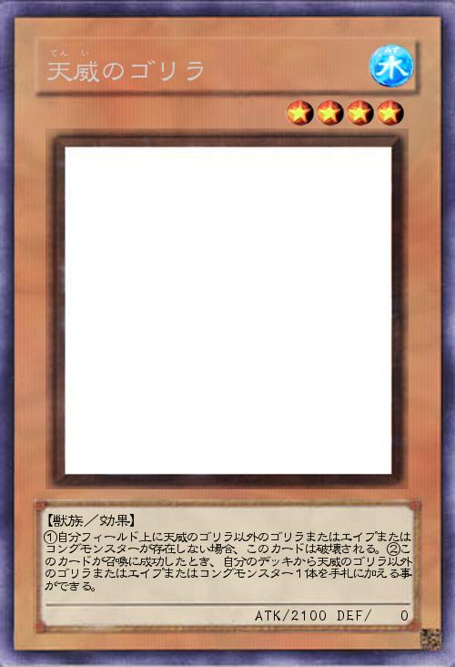 | ①自分フィールド上に天威のゴリラ以外のゴリラまたはエイプまたはコングモンスターが存在しない場合、このカードは破壊される。②このカードが召喚に成功したとき、自分のデッキから天威のゴリラ以外のゴリラまたはエイプまたはコングモンスター1体を手札に加える事ができる。 | |||