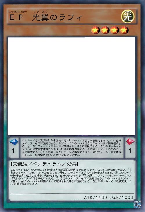| このカード名の①の方法による特殊召喚及び②③の効果はそれぞれ1ターンに1度しか使用できない。①:自分フィールドにモンスターが存在しない場合、このカードは手札から特殊召喚できる。②:このカードの特殊召喚に成功した場合、発動できる。自分のデッキから「EF 光翼のラフィ」以外のレベル4以下の「EF」モンスター1体を手札に加える。③:自分のメインフェイズに発動できる。このカードをPゾーンに置く。④:このカードが戦闘によって破壊された場合に発動できる。自分のデッキから「迅装天使」カード1枚を手札に加える。 | |||
