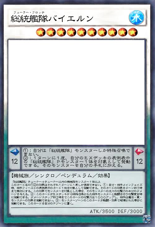 | ①:自分は「総統艦隊」モンスターしか特殊召喚できない。 ②:1ターンに1度、自分のEXデッキの表側表示の「総統艦隊」Pモンスター1体を対象として発動できる。そのモンスターを自分の手札に加える。 | |||