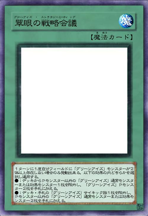 | 1ターンに1度自分フィールドに「グリーンアイズ」モンスターが2体以上存在しない場合のみ発動出来る。以下の効果の内どちらかを選択し適用する。 ●:デッキからPモンスター以外の「グリーンアイズ」通常モンスターまたは効果モンスター1枚を除外し、「グリーンアイズ」Pモンスター2枚を手札に加える。 ●:デッキ・手札の「グリーンアイズ」サイキック族1枚を除外し、Pモンスター以外の「グリーンアイズ」通常モンスターまたは効果モンスター2枚を手札に加える。 | |||
