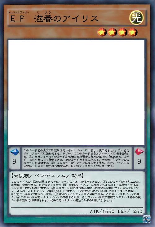 | このカード名の①②の効果はそれぞれ1ターンに1度しか使用できない。①:このカードの召喚に成功した場合、発動できる。自分のデッキから「EF 滋養のアイリス」以外のレベル4以下・光属性・天使族モンスター1体を特殊召喚する。②:このカードの特殊召喚に成功した場合に発動できる。自分を自分フィールドの「EF」モンスターの数×500LP回復する。この効果で自分を1000LP以上回復した場合、自分のデッキから2枚ドローする。③:自分のメインフェイズに発動できる。このカードをPゾーンに置く。④:このカードがモンスターゾーンに存在する限り、自分フィールドの天使族モンスターは相手の罠カードの効果では破壊されず、相手のモンスター・魔法の効果の対象にならない。 | |||