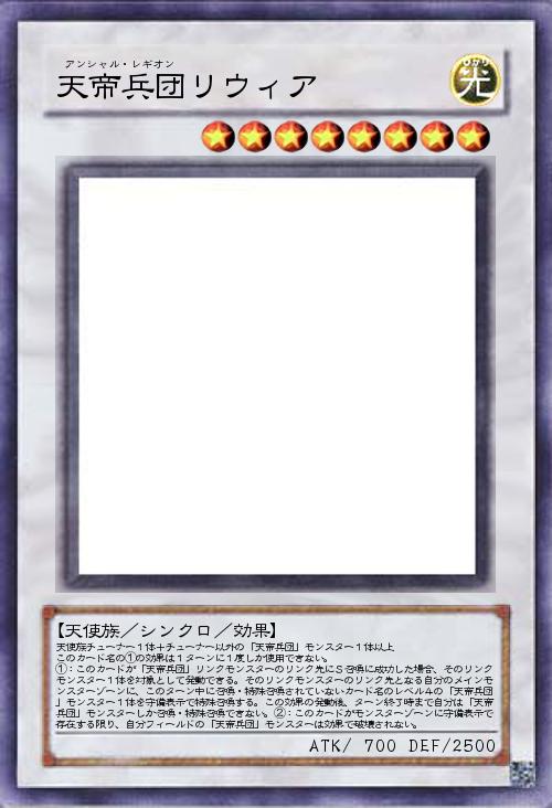| 天使族チューナー1体+チューナー以外の「天帝兵団」モンスター1体以上 このカード名の①の効果は1ターンに1度しか使用できない。 ①:このカードが「天帝兵団」リンクモンスターのリンク先にS召喚に成功した場合、そのリンクモンスター1体を対象として発動できる。そのリンクモンスターのリンク先となる自分のメインモンスターゾーンに、このターン中に召喚・特殊召喚されていないカード名のレベル4の「天帝兵団」モンスター1体を守備表示で特殊召喚する。この効果の発動後、ターン終了時まで自分は「天帝兵団」モンスターしか召喚・特殊召喚できない。②:このカードがモンスターゾーンに守備表示で存在する限り、自分フィールドの「天帝兵団」モンスターは効果で破壊されない。 | |||
