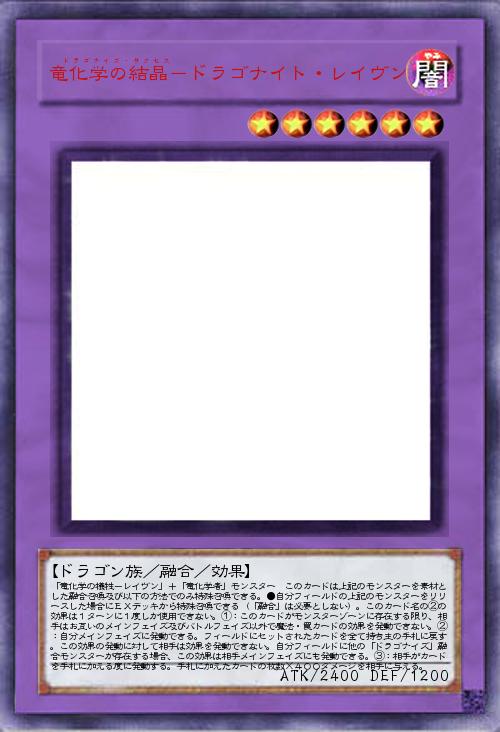 | 「竜化学の犠牲-レイヴン」+「竜化学者」モンスター このカードは上記のモンスターを素材とした融合召喚及び以下の方法でのみ特殊召喚できる。●自分フィールドの上記のモンスターをリリースした場合にEXデッキから特殊召喚できる(「融合」は必要としない)。このカード名の②の効果は1ターンに1度しか使用できない。①:このカードがモンスターゾーンに存在する限り、相手はお互いのメインフェイズ及びバトルフェイズ以外で魔法・罠カードの効果を発動できない。②:自分メインフェイズに発動できる。フィールドにセットされたカードを全て持ち主の手札に戻す。この効果の発動に対して相手は効果を発動できない。自分フィールドに他の「ドラゴナイズ」融合モンスターが存在する場合、この効果は相手メインフェイズにも発動できる。③:相手がカードを手札に加える度に発動する。手札に加えたカードの枚数×400ダメージを相手に与える。 | |||