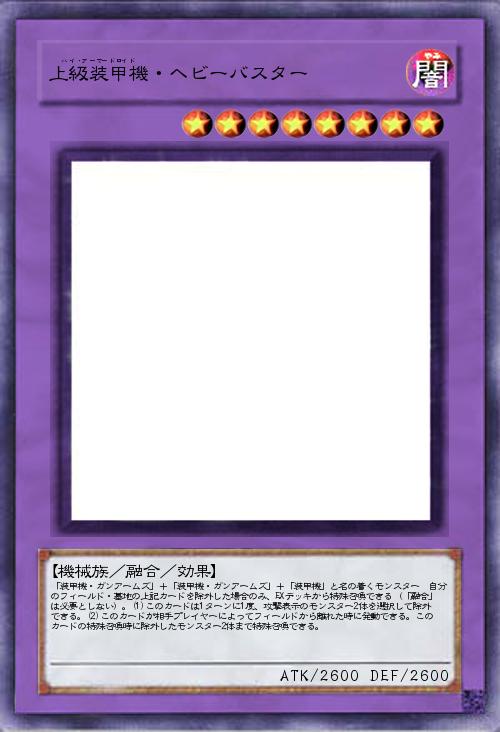 | 「装甲機・ガンアームズ」+「装甲機・ガンアームズ」+「装甲機」と名の着くモンスター 自分のフィールド・墓地の上記カードを除外した場合のみ、EXデッキから特殊召喚できる(「融合」は必要としない)。(1)このカードは1ターンに1度、攻撃表示のモンスター2体を選択して除外できる。(2)このカードが相手プレイヤーによってフィールドから離れた時に発動できる。このカードの特殊召喚時に除外したモンスター2体まで特殊召喚できる。 | |||