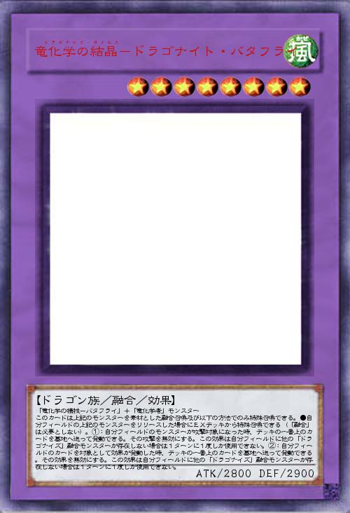 | 「竜化学の犠牲-バタフライ」+「竜化学者」モンスター このカードは上記のモンスターを素材とした融合召喚及び以下の方法でのみ特殊召喚できる。●自分フィールドの上記のモンスターをリリースした場合にEXデッキから特殊召喚できる(「融合」は必要としない)。①:自分フィールドのモンスターが攻撃対象になった時、デッキの一番上のカードを墓地へ送って発動できる。その攻撃を無効にする。この効果は自分フィールドに他の「ドラゴナイズ」融合モンスターが存在しない場合は1ターンに1度しか使用できない。②:自分フィールドのカードを対象として効果が発動した時、デッキの一番上のカードを墓地へ送って発動できる。その効果を無効にする。この効果は自分フィールドに他の「ドラゴナイズ」融合モンスターが存在しない場合は1ターンに1度しか使用できない。 | |||