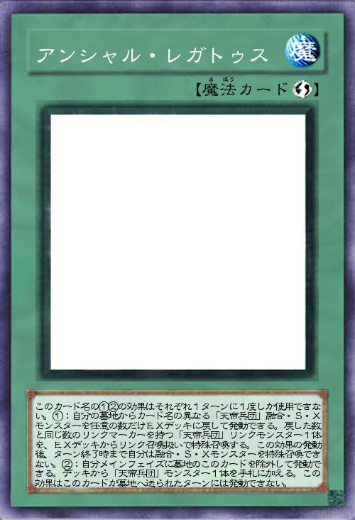 | このカード名の①②の効果はそれぞれ1ターンに1度しか使用できない。①:自分の墓地からカード名の異なる「天帝兵団」融合・S・Xモンスターを任意の数だけEXデッキに戻して発動できる。戻した数と同じ数のリンクマーカーを持つ「天帝兵団」リンクモンスター1体を、EXデッキからリンク召喚扱いで特殊召喚する。この効果の発動後、ターン終了時まで自分は融合・S・Xモンスターを特殊召喚できない。②:自分メインフェイズに墓地のこのカードを除外して発動できる。デッキから「天帝兵団」モンスター1体を手札に加える。この効果はこのカードが墓地へ送られたターンには発動できない。 | |||