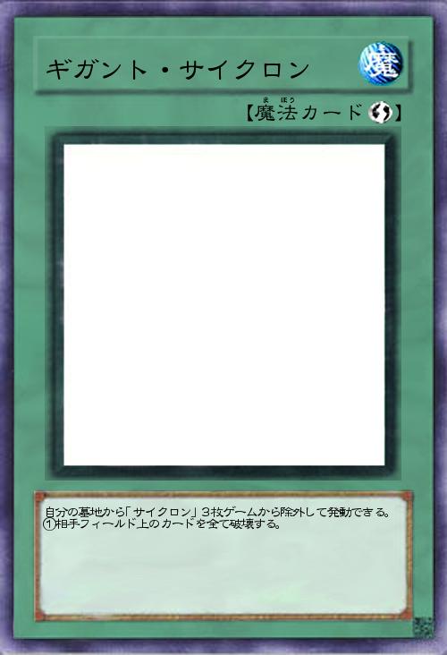 | 自分の墓地から「サイクロン」3枚ゲームから除外して発動できる。①相手フィールド上のカードを全て破壊する。 | |||