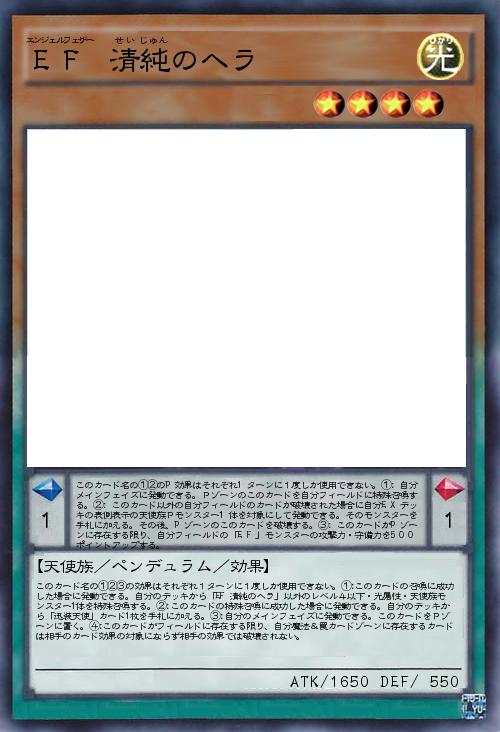 | このカード名の①②③の効果はそれぞれ1ターンに1度しか使用できない。①:このカードの召喚に成功した場合に発動できる。自分のデッキから「EF 清純のヘラ」以外のレベル4以下・光属性・天使族モンスター1体を特殊召喚する。②:このカードの特殊召喚に成功した場合に発動できる。自分のデッキから「迅装天使」カード1枚を手札に加える。③:自分のメインフェイズに発動できる。このカードをPゾーンに置く。④:このカードがフィールドに存在する限り、自分魔法&罠カードゾーンに存在するカードは相手のカード効果の対象にならず相手の効果では破壊されない。 | |||
