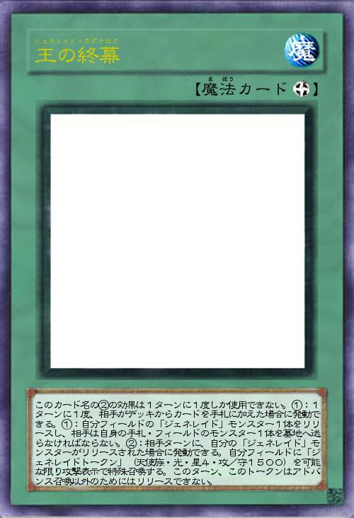 | このカード名の②の効果は1ターンに1度しか使用できない。①:1ターンに1度、相手がデッキからカードを手札に加えた場合に発動できる。①:自分フィールドの「ジェネレイド」モンスター1体をリリースし、相手は自身の手札・フィールドのモンスター1体を墓地へ送らなければならない。②:相手ターンに、自分の「ジェネレイド」モンスターがリリースされた場合に発動できる。自分フィールドに「ジェネレイドトークン」(天使族・光・星4・攻/守1500)を可能な限り攻撃表示で特殊召喚する。このターン、このトークンはアドバンス召喚以外のためにはリリースできない。 | |||