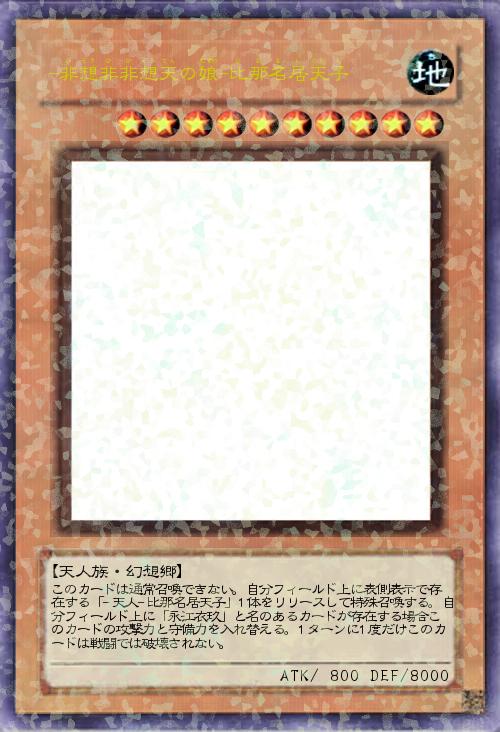 | このカードは通常召喚できない。自分フィールド上に表側表示で存在する「-天人-比那名居天子」1体をリリースして特殊召喚する。自分フィールド上に「永江衣玖」と名のあるカードが存在する場合このカードの攻撃力と守備力を入れ替える。1ターンに1度だけこのカードは戦闘では破壊されない。 | |||