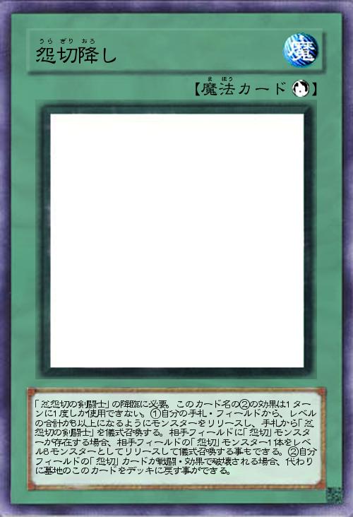 | 「忿怨切の剣闘士」の降臨に必要。このカード名の②の効果は1ターンに1度しか使用できない。①自分の手札・フィールドから、レベルの合計が8以上になるようにモンスターをリリースし、手札から「忿怨切の剣闘士」を儀式召喚する。相手フィールドに「怨切」モンスターが存在する場合、相手フィールドの「怨切」モンスター1体をレベル8モンスターとしてリリースして儀式召喚する事もできる。②自分フィールドの「怨切」カードが戦闘・効果で破壊される場合、代わりに墓地のこのカードをデッキに戻す事ができる。 | |||