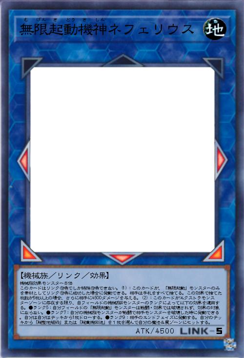 | 機械族効果モンスター5体 このカードはリンク召喚でしか特殊召喚できない。(1):このカードが、「無限起動」モンスターのみを素材としてリンク召喚に成功した場合に発動できる。相手は手札をすべて捨てる。この効果で捨てた枚数が5枚以上の場合、さらに相手に4500ダメージを与える。(2):このカードがエクストラモンスターゾーンに存在する限り、自フィールドの機械族Xモンスターのランクによって以下の効果を適用する。●ランク5:自分フィールドの「無限起動」モンスターは戦闘・効果では破壊されず、効果の対象にならない。●ランク7:自分の機械族モンスターが戦闘で相手モンスターを破壊した時に発動できる。自分は自分はデッキから1枚ドローする。●ランク9:相手のエンドフェイズに発動する。自分のデッキから「超整地破砕」または「超重機回送」を1枚を選んで自分の魔法&罠ゾーンにセットする。 | |||