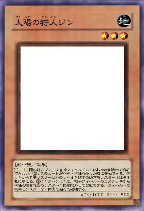 | ①:「太陽の狩人ジン」は自分フィールドに1体しか表側表示で存在できない。②:このカードが召喚・特殊召喚した時に発動できる。デッキからPモンスター以外のレベル3以下の通常モンスター1体を手札に加える。③:1ターンに1度、相手フィールドのEXデッキから特殊召喚されたモンスター1体を除外して発動できる。フィールドの効果モンスターを2体まで選んで破壊する。 | |||