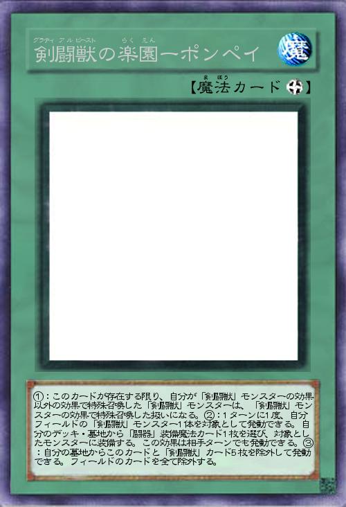 | ①:このカードが存在する限り、自分が「剣闘獣」モンスターの効果以外の効果で特殊召喚した「剣闘獣」モンスターは、「剣闘獣」モンスターの効果で特殊召喚した扱いになる。②:1ターンに1度、自分フィールドの「剣闘獣」モンスター1体を対象として発動できる。自分のデッキ・墓地から「闘器」装備魔法カード1枚を選び、対象としたモンスターに装備する。この効果は相手ターンでも発動できる。③:自分の墓地からこのカードと「剣闘獣」カード5枚を除外して発動できる。フィールドのカードを全て除外する。 | |||