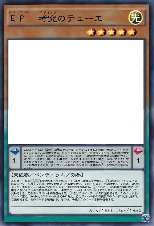 | このカード名の①②③④の効果はそれぞれ1ターンに1度しか使用できない。①:自分のメインフェイズに自分Pゾーンのモンスター1体を対象にして発動できる。そのモンスターを破壊する。その後、自分のデッキ・手札からレベル4以下のPモンスター1体を特殊召喚する。②:このカードの特殊召喚に成功した場合に自分EXデッキの表側表示の「EF 考究のテューエ」以外の「EF」Pモンスター1体を対象にして発動できる。そのモンスターを特殊召喚する。③:自分のメインフェイズに発動できる。このカードをPゾーンに置く。④:手札のこのカードを相手に見せ、自分フィールドの表側表示のカード1枚を対象にして発動できる。そのカードを破壊する。その後、手札のこのカードを特殊召喚する。 | |||