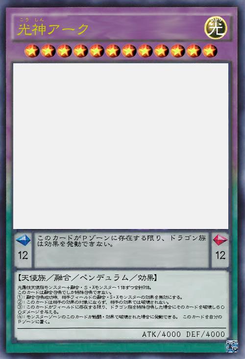 | 光属性天使族モンスター+融合・S・Xモンスター1体ずつ合計3体。 このカードは融合召喚でしか特殊召喚できない。 ①:融合召喚成功時、相手フィールドの融合・S・Xモンスターの効果を無効にする。 ②:このカードは相手の効果の対象にならず、相手の効果では破壊されない。 ③:このカードがフィールドに存在する限り、ドラゴン族を特殊召喚した場合にそのカードを破壊し600ダメージを与える。 ④:モンスターゾーンのこのカードが戦闘・効果で破壊された場合に発動できる。 このカードを自分のPゾーンに置く。 | |||