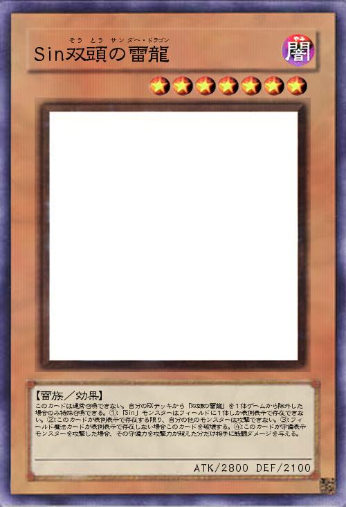 | このカードは通常召喚できない。自分のEXデッキから「双頭の雷龍」を1体ゲームから除外した場合のみ特殊召喚できる。①:「Sin」モンスターはフィールドに1体しか表側表示で存在できない。②:このカードが表側表示で存在する限り、自分の他のモンスターは攻撃できない。③:フィールド魔法カードが表側表示で存在しない場合このカードを破壊する。④:このカードが守備表示モンスターを攻撃した場合、その守備力を攻撃力が超えた分だけ相手に戦闘ダメージを与える。 | |||