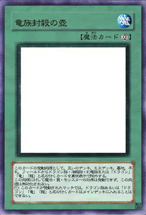 | このカードの発動処理として、互いのデッキ、EXデッキ、墓地、手札、フィールドからドラゴン族・海龍族・幻竜族または「ドラゴン」「竜」「龍」と名の付くカードを裏側表示で除外する。 この処理に対して魔法・罠・モンスターの効果は発動できず、この処理は無効化されない。 ①:このカードが発動されたマッチでは、ドラゴン族あるいは「ドラゴン」「竜」「龍」と名の付くカードはメインデッキに入れることはできない。 | |||