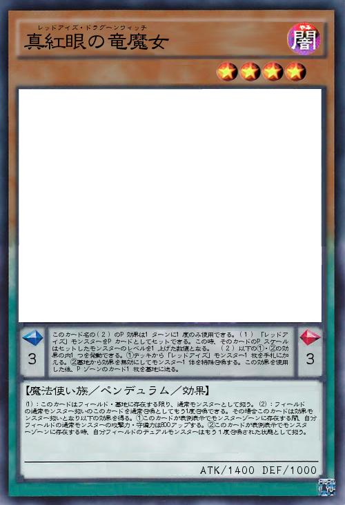 | このカード名の(2)のP効果は1ターンに1度のみ使用できる。(1)「レッドアイズ」モンスターをPカードとしてセットできる。この時、そのカードのPスケールはセットしたモンスターのレベルを1上げた数値となる。 (2)以下の①・②の効果の内1つを発動できる。①デッキから「レッドアイズ」モンスター1枚を手札に加える。②墓地から効果を無効にしてモンスター1体を特殊召喚する。この効果を使用した後、Pゾーンのカード1枚を墓地に送る。 | |||