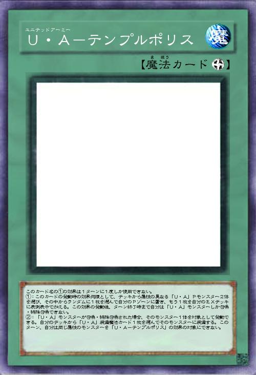 | このカード名の①の効果は1ターンに1度しか使用できない。 ①:このカードの発動時の効果処理として、デッキから属性の異なる「U・A」Pモンスター2体を選び、その中からランダムに1枚を選んで自分のPゾーンに置き、もう1枚を自分のEXデッキに表側表示で加える。この効果の発動後、ターン終了時まで自分は「U・A」モンスターしか召喚・特殊召喚できない。 ②:「U・A」モンスターが召喚・特殊召喚された場合、そのモンスター1体を対象として発動できる。自分のデッキから「U・A」装備魔法カード1枚を選んでそのモンスターに装備する。このターン、自分は同じ属性のモンスターを「U・A-テンプルポリス」の効果の対象にできない。 | |||