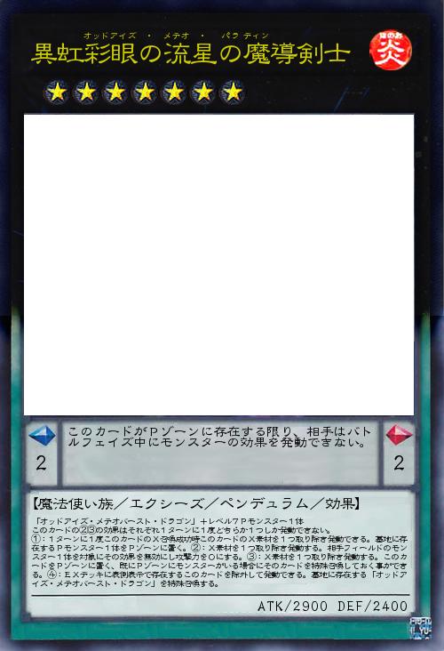 | 「オッドアイズ・メテオバースト・ドラゴン」+レベル7Pモンスター1体 このカードの②③の効果はそれぞれ1ターンに1度どちらか1つしか発動できない。 ①:1ターンに1度このカードのX召喚成功時このカードのX素材を1つ取り除き発動できる。墓地に存在するPモンスター1体をPゾーンに置く。②:X素材を1つ取り除き発動する。相手フィールドのモンスター1体を対象にその効果を無効にし攻撃力を0にする。③:X素材を1つ取り除き発動する。このカードをPゾーンに置く、既にPゾーンにモンスターがいる場合にそのカードを特殊召喚しておく事ができる。④:EXデッキに表側表示で存在するこのカードを除外して発動できる。墓地に存在する「オッドアイズ・メテオバースト・ドラゴン」を特殊召喚する。 | |||