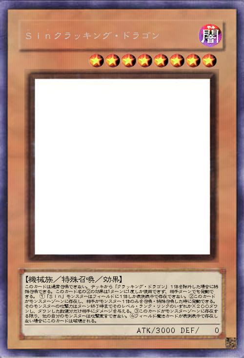 | このカードは通常召喚できない。デッキから「クラッキング・ドラゴン」1体を除外した場合に特殊召喚できる。このカード名の②の効果は1ターンに1度しか使用できず、相手ターンでも発動できる。 ①「Sin」モンスターはフィールドに1体しか表側表示で存在できない。②このカードがモンスターゾーンに存在し、相手がモンスター1体のみを召喚・特殊召喚した時に発動できる。そのモンスターの攻撃力はターン終了時までそのレベル・ランク・リンクのいずれか×200ダウンし、ダウンした数値分だけ相手にダメージを与える。③このカードがモンスターゾーンに存在する限り、他の自分のモンスターは攻撃宣言できない。④フィールド魔法カードが表側表示で存在しない場合にこのカードは破壊される。 | |||