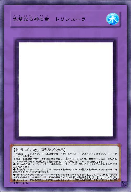 | 「氷獄龍 トリシューラ」+「氷結界の龍 トリシューラ」+「ヴェルズ・ウロボロス」+「トリシューラの影霊衣」 このカードは融合召喚でしか特殊召喚できない。①:1ターンに1度、墓地のモンスターを除外し、以下の効果から1つを選択して発動できる。この効果は相手ターンでも発動できる。 ●「氷結界の龍 トリシューラ」:相手の手札・フィールド・墓地のカードをそれぞれ1枚まで選んで除外できる。 ●「氷獄龍 トリシューラ」:自分のデッキ・相手のデッキの一番上・相手のEXデッキの順に確認してそれぞれ1枚ずつ除外する。 ●「ヴェルズ・ウロボロス」:フィールドに存在するカードを1枚対象として手札に戻す。その後お互いの手札を1枚墓地に送り、相手の墓地からカードを1枚除外する。 ●「トリシューラの影霊衣」:相手が自分のモンスターを対象にした場合、手札を捨ててその効果を無効にする。 | |||