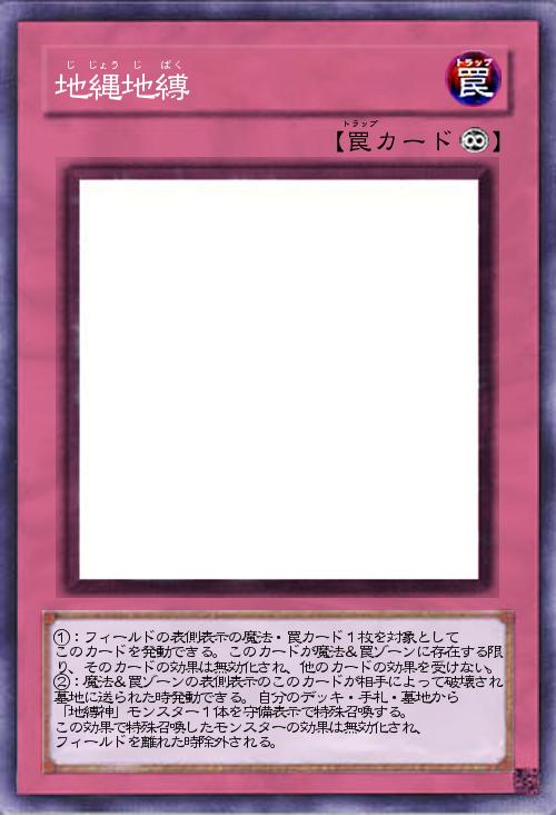 | ①:フィールドの表側表示の魔法・罠カード1枚を対象として このカードを発動できる。このカードが魔法&罠ゾーンに存在する限り、そのカードの効果は無効化され、他のカードの効果を受けない。 ②:魔法&罠ゾーンの表側表示のこのカードが相手によって破壊され墓地に送られた時発動できる。自分のデッキ・手札・墓地から 「地縛神」モンスター1体を守備表示で特殊召喚する。 この効果で特殊召喚したモンスターの効果は無効化され、 フィールドを離れた時除外される。 | |||