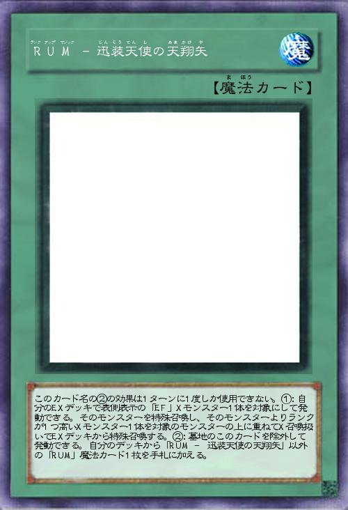 | このカード名の②の効果は1ターンに1度しか使用できない。①:自分のEXデッキで表側表示の「EF」Xモンスター1体を対象にして発動できる。そのモンスターを特殊召喚し、そのモンスターよりランクが1つ高いXモンスター1体を対象のモンスターの上に重ねてX召喚扱いでEXデッキから特殊召喚する。②:墓地のこのカードを除外して発動できる。自分のデッキから「RUM - 迅装天使の天翔矢」以外の「RUM」魔法カード1枚を手札に加える。 | |||