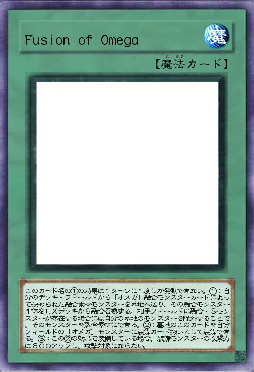 「ようやくできたぜΩ融合。効果は《月光融合》を意識したもの。月光融合と違う点はあちらはEXから出されたモンスターがいる場合、デッキ融合もできるところが、元からデッキ融合になっている。それと融合とSのみになっている。そして追加の融合素材は墓地から除外。普通。