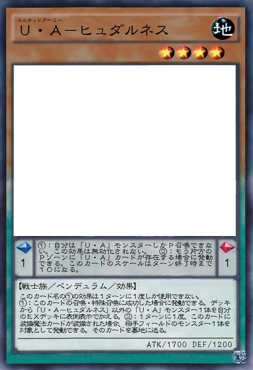 | このカード名の①の効果は1ターンに1度しか使用できない。 ①:このカードの召喚・特殊召喚に成功した場合に発動できる。デッキから「U・A-ヒュダルネス」以外の「U・A」モンスター1体を自分のEXデッキに表側表示で加える。②:1ターンに1度、このカードに装備魔法カードが装備された場合、相手フィールドのモンスター1体を対象として発動できる。そのカードを墓地に送る。 | |||