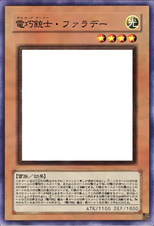 | このカード名の①②の効果はそれぞれ1ターンに1度しか使用できない。①:このカード以外の自分フィールドの雷族モンスター1体、またはこのカードの攻撃力より低い攻撃力を持つトークン以外の相手フィールドのモンスター1体を対象として発動できる。対象のモンスターの攻撃力とこのカードの元々の攻撃力の差分のダメージを、対象のモンスターの元々のコントローラーに与える。元々のコントローラーが相手となるモンスターを対象としてこの効果を発動するターン、自分はバトルフェイズを行えない。②:このカードがフィールドに存在する状態で自分または相手がこのカードの①の効果または「電巧銃」魔法・罠カードの効果でダメージを受けた場合に発動できる。除外されている自分のカードの中から、「電巧銃」魔法・罠カード1枚を選んで手札に加える。 | |||