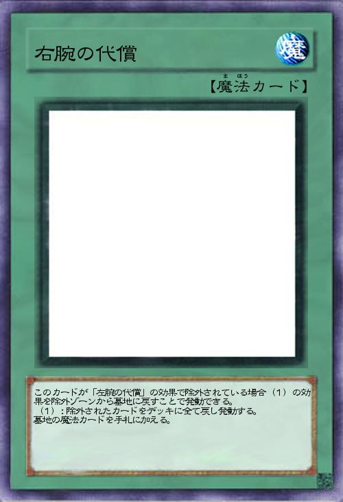 | このカードが「左腕の代償」の効果で除外されている場合(1)の効果を除外ゾーンから墓地に戻すことで発動できる。 (1):除外されたカードをデッキに全て戻し発動する。 墓地の魔法カードを手札に加える。 | |||