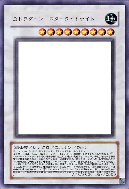 「Ωシンクロモンスター。珍しくシンクロユニオンな上、PモンスターでもないのにEXデッキに表側表示で置ける(P召喚も可)。Pモンスターとしては扱わないため、そこだけは注意。発送としてはPでもないけどEXからP召喚できる、シンクロのユニオンっていうのどう?って友人からアドバイスもらいました。②のユニオン的効果としては装備モンスターに破壊耐性を付与。装備対象はなんでもいいので装備するだけでアドは稼げなくもない。残しておきたいモンスターにつけるのもよし、装備カードに関連する効果に使うもよし。③はEXから出されたら装備魔法を貼りーポッター。装備条件さえ合えば自分モンスターを脳筋にできる。リンクスだったら多分強い(ガーディアンの力)カード名は「星明かり」の意味を持つ「Starlight」と「乗ること」の意味を持つ「ride」をかけたもの。ナイトはΩだから(?)イメージとしてはルィツァーリィがスターダストに載っている感じ。召喚条件もチューナーのみでOK。(「チューナー以外の」とは書いていないため)召喚条件のせいで採用デッキは選ぶけどそのかわりちょっと環境を壊すぐらいのカードパワーにした。」(2020-03-07 12:00)