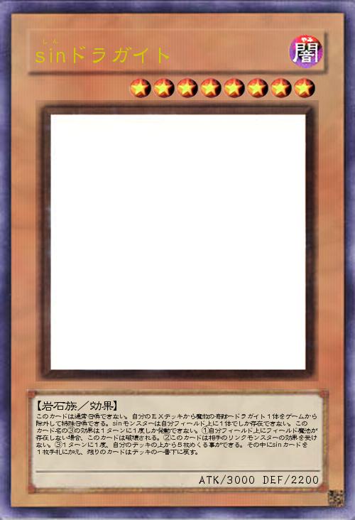 | このカードは通常召喚できない。自分のEXデッキから魔救の奇跡ードラガイト1体をゲームから除外して特殊召喚できる。sinモンスターは自分フィールド上に1体でしか存在できない。このカード名の③の効果は1ターンに1度しか発動できない。①自分フィールド上にフィールド魔法が存在しない場合、このカードは破壊される。②このカードは相手のリンクモンスターの効果を受けない。③1ターンに1度、自分のデッキの上から5枚めくる事ができる。その中にsinカードを1枚手札に加え、残りのカードはデッキの一番下に戻す。 | |||