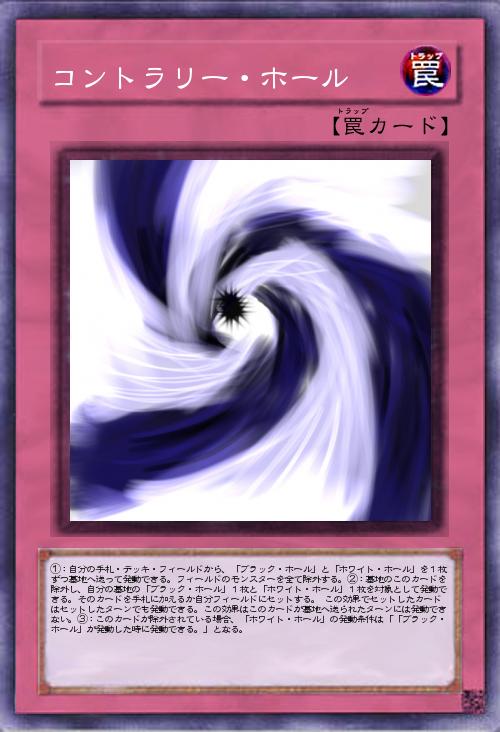 | ①:自分の手札・デッキ・フィールドから、「ブラック・ホール」と「ホワイト・ホール」を1枚ずつ墓地へ送って発動できる。フィールドのモンスターを全て除外する。②:墓地のこのカードを除外し、自分の墓地の「ブラック・ホール」1枚と「ホワイト・ホール」1枚を対象として発動できる。そのカードを手札に加えるか自分フィールドにセットする。 この効果でセットしたカードはセットしたターンでも発動できる。この効果はこのカードが墓地へ送られたターンには発動できない。③:このカードが除外されている場合、「ホワイト・ホール」の発動条件は「「ブラック・ホール」が発動した時に発動できる。」となる。 | |||