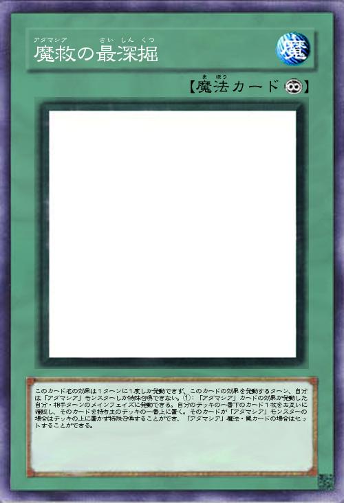 | このカード名の効果は1ターンに1度しか発動できず、このカードの効果を発動するターン、自分は「アダマシア」モンスターしか特殊召喚できない。①:「アダマシア」カードの効果が発動した自分・相手ターンのメインフェイズに発動できる。自分のデッキの一番下のカード1枚をお互いに確認し、そのカードを持ち主のデッキの一番上に置く。そのカードが「アダマシア」モンスターの場合はデッキの上に置かず特殊召喚することができ、「アダマシア」魔法・罠カードの場合はセットすることができる。 | |||