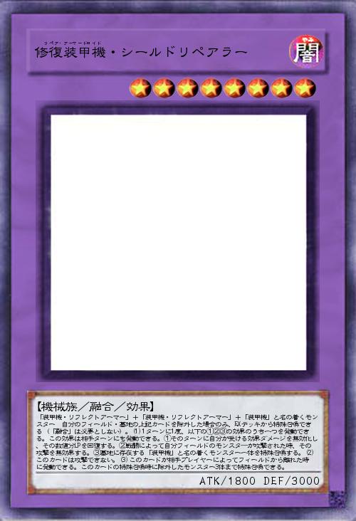 | 「装甲機・リフレクトアーマー」+「装甲機・リフレクトアーマー」+「装甲機」と名の着くモンスター 自分のフィールド・墓地の上記カードを除外した場合のみ、EXデッキから特殊召喚できる(「融合」は必要としない)。(1)1ターンに1度、以下の①②③の効果のうち一つを発動できる。この効果は相手ターンにも発動できる。①そのターンに自分が受ける効果ダメージを無効化し、その数値分LPを回復する。②戦闘によって自分フィールドのモンスタ―が攻撃された時、その攻撃を無効果する。③墓地に存在する「装甲機」と名の着くモンスター一体を特殊召喚する。(2)このカードは攻撃できない。(3)このカードが相手プレイヤーによってフィールドから離れた時に発動できる。このカードの特殊召喚時に除外したモンスター3体まで特殊召喚できる。 | |||