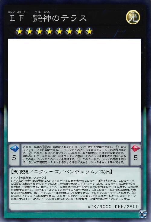 | レベル8天使族モンスター×2 レベル8がP召喚可能な場合にエクストラデッキの表側表示のこのカードはP召喚できる。このカード名の②③の効果はそれぞれ1ターンに1度しか使用できない。①:1ターンに1度、このカードのX素材を2つ取り除いて発動できる。相手フィールドの表側表示のカード全て元々の持ち主のデッキに戻す。この効果を発動するターン、自分はバトルフェイズを行うことができない。②:このカードのX召喚に成功した場合に自分の墓地の「EF」モンスター1体を対象にして発動できる。そのモンスターをデッキに戻す。③:自分のメインフェイズに発動できる。このカードをPゾーンに置く。④:このカードがモンスターゾーンに存在する限り、自分フィールドの天使族モンスターの攻撃力・守備力を800ポイントアップする。 | |||