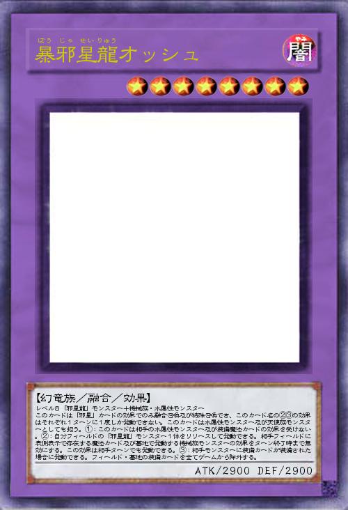 | レベル8「邪星龍」モンスター+機械族・水属性モンスター このカードは「邪星」カードの効果でのみ融合召喚及び特殊召喚でき、このカード名の②③の効果はそれぞれ1ターンに1度しか発動できない。このカードは水属性モンスター及び天使族モンスターとしても扱う。①:このカードは相手の水属性モンスター及び装備魔法カードの効果を受けない。②:自分フィールドの「邪星龍」モンスター1体をリリースして発動できる。相手フィールドに表側表示で存在する魔法カード及び墓地で発動する機械族モンスターの効果をターン終了時まで無効にする。この効果は相手ターンでも発動できる。③:相手モンスターに装備カードが装備された場合に発動できる。フィールド・墓地の装備カードを全てゲームから除外する。 | |||