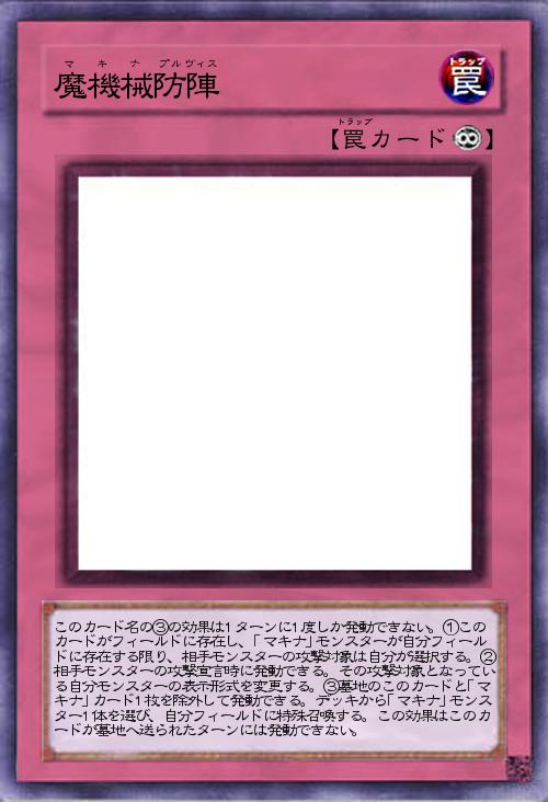 | このカード名の③の効果は1ターンに1度しか発動できない。①このカードがフィールドに存在し、「マキナ」モンスターが自分フィールドに存在する限り、相手モンスターの攻撃対象は自分が選択する。②相手モンスターの攻撃宣言時に発動できる。その攻撃対象となっている自分モンスターの表示形式を変更する。③墓地のこのカードと「マキナ」カード1枚を除外して発動できる。デッキから「マキナ」モンスター1体を選び、自分フィールドに特殊召喚する。この効果はこのカードが墓地へ送られたターンには発動できない。 | |||