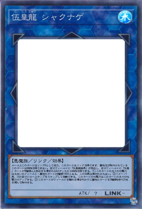 | ルール上このカードはリンク6として扱う。このカードはリンク召喚できず、墓地及び除外されているこのカードは特殊召喚できない。自分フィールドに「伍皇龍曲界」が存在し、自分フィールドに「伍皇」カードが5種類以上存在する場合のみEXデッキから特殊召喚できる。①:このカードの元々の攻撃力はお互いのフィールド・墓地のカードの種類×600となる。この効果は無効化されない。②:1ターン1度、次の自分ドローステップをスキップして発動できる。このカードの攻撃力はこのカードの元々の攻撃力分アップする。③:このカードがフィールドを離れる場合代わりに墓地のカードを3種類合計で3枚を選んで除外する。 | |||