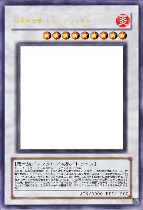 | チューナー+チューナー以外のトゥーンモンスター1体以上 このカードの②の効果は1ターンに1度しか発動できない。このカードが特殊召喚したターン、攻撃できない。トゥーンワールドがフィールド上に存在しない場合、このカードは破壊される。①相手フィールド上にトゥーンモンスターが存在しない場合、このカードは相手に直接攻撃できる。②自分のデッキから装備魔法を1枚手札に加える。この効果が相手のカードの効果によって無効化された時、相手ライフに2000ダメージを与える。③このカードが戦闘で相手モンスターを破壊したときに発動できる。自分のデッキから聖騎士モンスターかトゥーンモンスター1体を手札に加える。 | |||